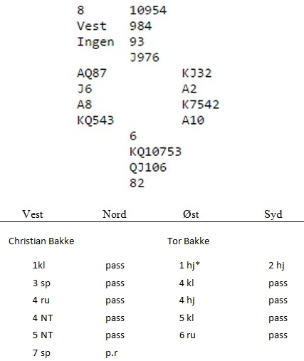1 hjerter var overføring og viste minst 4 spar. Etter tre cue bids viste 5 kl 0 eller 3 av 5 ess. 5 NT viste at alle nøkkelkort var på plass og 6 ruter viste ruter konge. Flere spillere kom i 7 spar som er forholdvis hardt meldt, men juniorspilleren Christian Bakke var den eneste som spilte hjem storeslemmen. Etter hjerter ut til esset fulgte spar konge og ess som avslørte 4-1 sitsen i trumf. De fleste spilte nå på 3-3 sits i ruter, men ble overtrumfet og gikk opptil 2-3 beter. Christian fant imidlertid en mer sjanserik spilleføring. Det er like sannsynlig at kløverfargen sitter 3-3 som ruterfargen, så han fortsatt med 3 toppstikk i kløver. Hadde fargen sittet jevnt kunne han ha kastet hjerter i bordet og stjålet en hjerter som ville sikret 13 stikk. De som spilte på ruteren 3-3 hadde ingen tilleggssjanse på kontrakten, men Christian så muligheten om kløveren ikke satt jevnt. Han godspilte kløverfargen med en stjeling, tok spar knekt og spilte seg hjem på ruter og trakk ut den siste trumfen. Syd hadde ikke uventet konge-dame i hjerter etter sin innmelding og også lengden i ruter siden han var kort i begge sorte farger. Da femte kløver ble innkassert var syd skvist. Han måtte kaste sine hjerterhonnører for å hindre at bordet tok 2 ruterstikk til slutt, men da sikret hjerter knekt det nødvendige ekstra stikket.