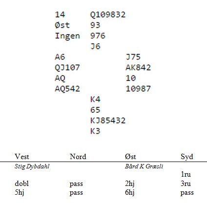 _____________________________________________________________________________________ Stig Dybdahl har sendt en hyggelig mail og forteller om både god spilling og bra glid under Trondheim Cup lagturnering. Han har behov for å komme med et spill eller to for som han sier: " I fare for at siden din kommer til å bli et eneste Klukken show de neste månedene, så tenkte jeg å legge med et spill eller et meldeproblem. Ihvertfall for Kunstneren som nekter å diskutere system fordi da kan det bli systemsvikt." Den logikken kan en vel diskutere , men i spillet under likte jeg 5hj veldig godt. "Se på hjerteren din makker. Jeg kontrollerer de andre fargene, men trumfen min er tynn." Ingen vitenskapelig meldning, men praktisk og en unngår misforståelser med en ny makker. Kun fire par kom i slem og med snill sits vant alle 13 stikk. Så fortsetter Stig: