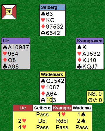 Spill 25: Ikke helt på hugget Jeg skjønner ikke helt hvorfor Terje Lie ikke dobler 2sp "på veien" til 4hj. Har makker en stor fordelingshånd, kan de alltids komme dit. Det ser ut som det er bare tre stikk i 2sp og 1100, men jeg tror han må få to sparstikk for "bare" 800 fordi ØV må spille spar for å hindre hjerterstjelilga i bordet. Da tror jeg syd må få for både damen og knekten etter hvert. I spill 26 er Nils flink i en hard 3NT og finner en god spilleføring for ni stikk, men svensken er like dyktig på det andre bordet. I spill 28 er han flink enda en gang i 3hj og får to stikk mer enn svensken i 3hj. Ni til Norge og to sonebeit på det andre bordet. En åtte til Norge og stillingen er 37 - 26 med et spill igjen. Det ender uavgjort og et knepent tap til Norge. En stund så det mørkt ut, men vi redda til corner. __________________________________________________________________________________