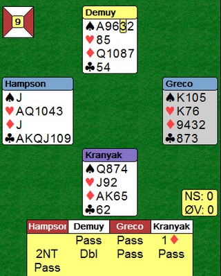 I det pågående amerikanske mesterskapet har de kommet til finalen, og der er det Fireman og Diamond som skal gjøre opp om seieren. Vinneren av denne kampen får være USA 2 i det neste Bermuda Bowl. Da er det kjipt å gjette feil i slike spill som det under. Stikker han med kongen, skriver Hampson +1490 i 2NT med tolv stikk. Dessverre for han la han liten i bordet og måtte notere en beit.