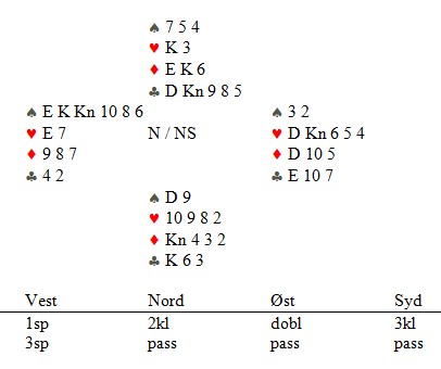 Stig servet kløver dame. Even stikker med A og forlanger hjerter dame som går rundt til kongen. Stig tar for kløver kn. Helt uanstrengt ligger så ruter 6 i disken. Stakkars Even som ikke vet mer om Jørgen sine honnører i syd enn at han har kløver konge klarer ikke å gå opp på Damen. Det ender da med 8 stikk som gjør at kampen ender med 19 – 14 seier til Stjørkjerik.