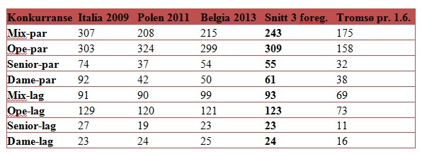 Jeg har laga meg litt deltakingsstatistikk basert på dei tre siste opne EM. Som tidlegare påpeika er det open klasse, og særleg ope par, eg er litt bekymra for. Men denne tevlinga startar jo ikkje før 7. juli og mange vil sikkert melde seg på i Tromsø. Med tanke på det store potensialet i seniorklassa, er eg sjølvsagt og samd med Jostein Sørvoll. Ut frå medlemsmassen i NBF burde jo seniorklassa vore størst :) Eg reknar også med at mange, som meg sjølv, vil ta turen til Tromsø utan å melde seg på til EM-tevlingane. Det er jo massevis av bridge også for oss som synes EM ligg litt over kompetansenivået :) Side- og kveldsturneringar i NBF-regi kvar dag + 4 større opne par- og lagtevlingar i EBL-regi i løpet av EM (inkl. Marit Sveaas-turneringa).