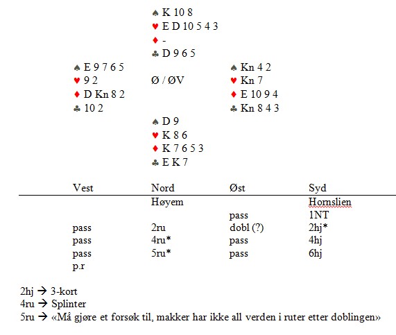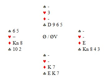 På den siste trumfen må øst enten kvitte seg med ruteresset eller gi opp kløveren. 12 stikk og +980. Eneste par med den scoren i Fosnavåg.