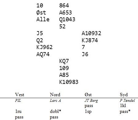 Sittende i nord med god fordelingshånd åpner Juul med 1 hjerter, dobling fra meg i øst og 4 hjerter fra Steinar. Hva ville du ha spilt ut fra øst?