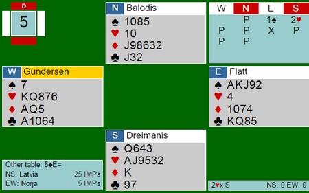 Noen har fortalt meg at det ikke er så farlig å melde inn med dårlige kort når en har lengde i motpartens farge, men Anders Gundersen og Espen Flått viste at det ikke stemmer. Spillefører fikk kun fire trumfstikk. De andre ni tok Norge og noterte 1100 på sin side. Jeg tror faktisk de kunne holdt han ned enda et stikk. _________________________________________________________________