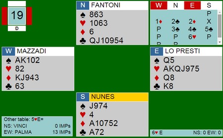 Fra NewInBridge.com Motstanderne anklaget de to høyest rangerte spillerne i verden for at de på en eller annen måte har signaler seg i mellom. I lovboka kalles dette "Å motta UI, ulovlig informasjon). Dette er en sinnsykt alvorlig beskyldning og saken har vært sett på av det jeg forstår er det italienske lovutvalget. Her er spillet fra det italienske lagmesterskapet for ikke lenge siden. 2ru viser hjerterfarge. Claudio Nunes spilte ut ruteresset og ga makker en stjeling. Så tok de to kløverstikk for -300. Beskyldningene går ut på at når ikke Nunes tok for kløveresset i stikk to, måtte han på en eller annen måte vite at makker hadde singelton og ikke D6 dobbel. I anklagen er det ikke sagt noe om på hvilken på Nunes skulle fått denne informasjonen. Motstandernes poeng var visstnok ikke den tredje beita, men at syd ikke tok for kløveresset i stikk to. Nunes innrømmer at det var "an abnormal play, but I had a mental blackout". I hodet hans måtte spillefører være renons i kløver siden han hoppet til 6hj, men når han ser bordet og tenker på meldingsforøpet er det svært lite sannsynlig. Da må makker ha KD åttende i kløver og slutt. Ingen melder inn 2kl på det. (selv om 2kl aktuelt var veldig underlig) Det er lov å ha blackout's i bridge, selv for de beste. Derfor er dommen "The Judge does not have any proof that UI was received by either player, so we acquit FIGB members Fantoni Fulvio and Nunes Claudio." __________________________________________________________ Det vil ikke forbause meg om siste ord ikke er sagt. __________________________________________________________