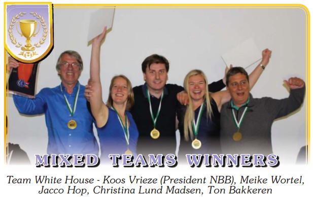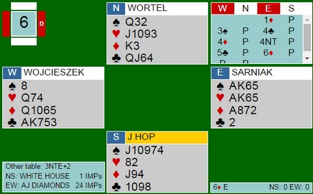 Gratulerer til Em første gullvinnerer, WHITE HOUSE, fra Nederland og Danmark. Det var en svært jevn finale. I andre halvrunde ble scoren 7-3. Noe mindre over 14 spill kan jeg nesten ikke huske. Nok en gang var det er stort spill som avgjorde finalen og det var rett og slett et valg i trumf. Sluttscoren 46 - 37. Hjerter ut til kongen og en liten ruter til tieren ordner biffen med litt forsiktig spilleføring etterpå. Den polske spilleføreren brukte bordets ruter dame første gang og da ble det en beit. Siden White House var i 3NT på det andre bordet, svingte dette godt over 20 IMP. Har du ikke noe å gjøre i 4 timer og 35 minutter, kan du se hele kampen (inkludert pausen) her. _____________________________________________________________________________
