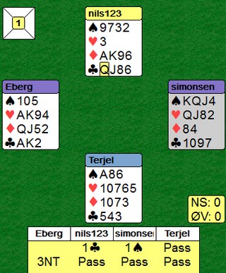 Deler av landslaget i åpen klasse spilte i kveld (søndag) nok en treningskamp på BBO. Jeg tenkte å vise noen av spillene fra bordet der Erik Berg - Steffen Fredrik Simonsen spilte mot Nils Kvangraven - Terje Lie. Mange av spillene har ikke noen større poenger, annet enn at det kan kanskje være lærerrikt å se hvordan de presumtivt beste melder og spiller. Denne ganger er jeg ikke ute etter å vise gode eller dårlige prestasjoner. SPILL 1 Legg merke til den tynne åpninga til Nils. Kun 10hp, men mottakelig i tre farger. Førstemann på banen. Steffen melder inn på firekortfarge, men omtrent samme argumentet som Nils. "Vi må tidlig inn i meldingsforløpet": Erik Berg er en praktiker og melder det som står, nemlig 3NT. _____________________________________________________________________________