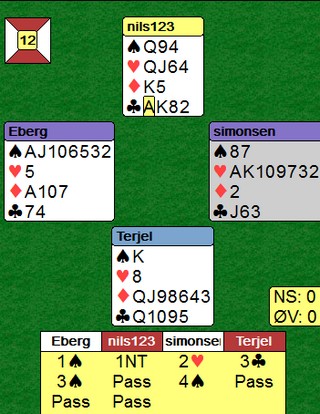 SPILL 3 Så en flott storeslem av Berg - Simonsen. 4kl viser renons og EK der var kanskje ikke det beste, men det er jo aldri noen ulempe med esser og konger, så fremt hånda ellers også er sterk. Erik stjal to to små kløverne i bordet og kasta to spar på EK i ruter. 13 stikk.