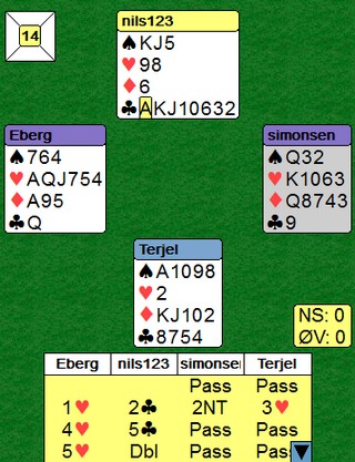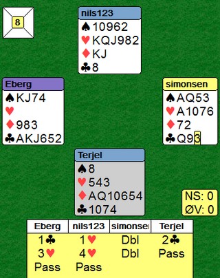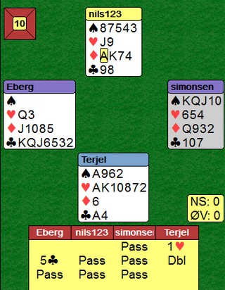 Godt meldt av Berg - Simonsen, men det ble en beit. Jeg vet ikke hva som er beste spilleplan etter EK i kløver ut, men den Erik valgte gikk i alle fall skeis. Han stjal tredje kløveren, ruter ess og ruter til stjeling. Så EK i hjerter og når Terje Lie stjal med sparkongen, ble det beit. Spar til esset etter ruterstjelingen, og så hjerter hadde gitt +620, men det er ikke sikkert det er en bedre plan.