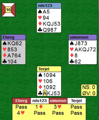 Berg - Simonsen tar den helt ut i siste spill og er vel mer heldige enn dyktige?. Kortene hang flott sammen og +620. Det er vel sjelden en løfter makkers sperremelding etter å ha passet i åpning, selv om øst var i ugunstig. "Don't argue with success, Snurr" Min oppsummering av 16 spill: Nils og Terje var svært gode. Jeg kunne ikke se en eneste feil de gjorde, mens de hadde flere gode vurderinger. Erik og Steffen var mer rustne og hadde minst tre uheldige/dårlige vurderinger. -1100 og -800 er aldri bra, selv om det kunne vært rett begge to. Å gå beit i frivillige 5hj uten at den sitter spesielt surt, er ikke bra. Spilleføringen i 4sp i 12, var vel heller ikke noe unge Berg vil få medalje for. En bra dag på jobben for Kvangraven - Lie, en ikke fullt så god for Berg - Simonsen.