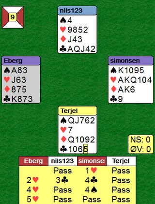 Nok "Møllers tran" av Erik Berg. Med vest sine kort kan alt være rett, så slike spill må man nesten regne med. -1100 gjør vondt uansett. Nils passer over 5kl med EK i en farge og makker har åpnet, uten at jeg helt skjønner hvorfor . Han ble reddet av gong-gongen.