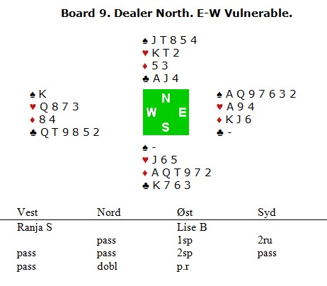 For det var akkurat det Lise Blågestad var 99,9% sikker på at den gjorde. Hun hadde følgende kort. ED97632 E94 KKn6 - og var i 2sp doblet (!). Dette må da stå, tenkte hun, og var enda sikrere når makker hadde sparkongen! Kortene ser du under og selv med alle hendene synlig sliter jeg litt med å finne det åttende stikket etter kløver ut. Det går sikkert an, men jeg har ikke sett noen som fikk mer enn syv stikk i sparkontrakt. Jeg snakket med Øyvind Saur om det samme spillet og i deres kamp ble det et stor tap på en noe underlig måte. Christer Kristoffersen og Øyvind Saur satt ØV og Christer i øst åpnet med 1sp. Syd meldte inn 2ru og Øyvind i vest hadde en "opplagt" negativ dobling. Nå kunne ikke Christer finne noe vei til å undersøke slem, så han hoppet bare til 4sp. Sløyfe på og masse beit!! Lagkameratene Ulf Tundal og Glenn Grøtheim åpner med 9hp når de har femkort major og da skjønne du sikkert at NORD åpnet med 1sp. Da kom ikke ØV i utgang.