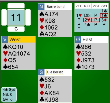 Børre og Ole oppdaga at hjerteren var for tynn til å spille 3NT. Det satt fint i 4sp, men den hadde i alle fall vinnersjanse. KDx i kapp var akkurat det som trengtes og +10 til SLUFSA mot 3NT en beit. Jeg har tro på norsk lag i semifinalen!!