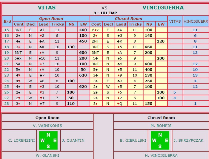 Alle de tre norske lagene er ute etter t ap i kvartfinalen. Nærmest var lag Heskje som møtte forhåndsfavorittene "BAKER" (USA/Nederland). Etter 28 spill var stillingen uavgjort og da er regelen i EM at det spilles sudden death, ett og ett spill. Jeg fikk ikke sett kortene i det ene de rakk, men Baker spilte hjem 4kl dobla på det ene bordet og når det andre bordet kun var i delkontrakt, er det bare å takke for seg. Tap også for GUNSMOKE og GUTS.COM. i skrivende stund er resultatsida til EBL nede, men plutselig er den oppe igjen og du kan se detaljene. Tap for Gunsmoke i sin kvartfinale mot Nederland. Her Ida og Gunn i kamp mot Anneke Simon og Jet Panman