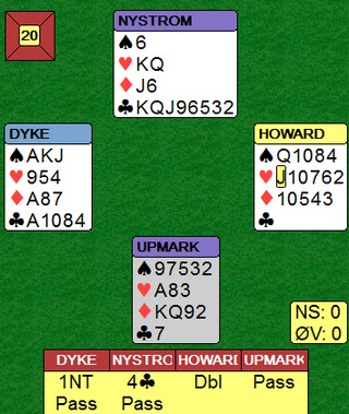 Jeg har tidligere fortalt deg om Howard - Dyke sin offensive meldestil. Her ble de straffet når øst hadde til en opplysende dobling over 4kl. Han så for seg supertilpass og en utgang i hus på 18 hp. Vest hadde en opplagt pass, men fortalte samtidig at kløveren satt som den gjorde. -710 er katastrofe i lag. Arild Rasmussen meldte også inn 4kl, men det gikk det pass rundt og en beit. SÅ ET GLIMRENDE SPILL AV JON SVEINDAL!! Du får hjerter 9 ut som står. Jeg vil påstå at de aller, aller fleste av oss hadde stjålet og lagt ned EK i spar. Ikke Jon. Han kastet rutertaperen sin og du ser snart hvorfor det var så bra?