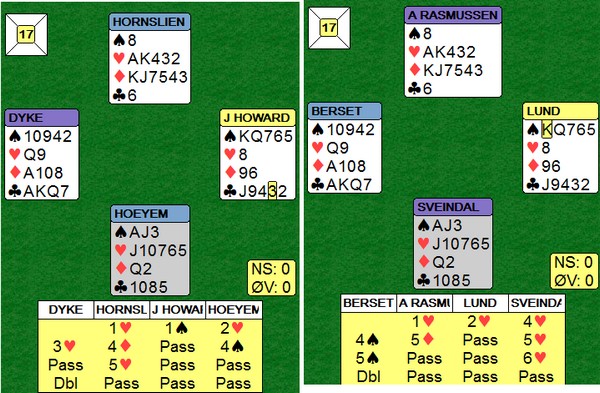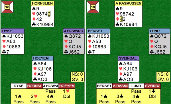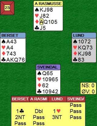 Slufsa hadde en ledelse med 71-28 etter to sesjoner, men i den tredje kom Noralia best i gang. NS: Sveindal - Rasmussen ØV: Høyem - Hornslien Jon Sveindal viser igjen god teknikk etter at ØV ikke var helt nøyaktig i innledningen av spillet. Kløver konge i utspill fra Olav Arve Høyem og mer kløver til esset. Nå gjorde Aksel Hornslien det som de fleste av oss ville gjort, nemlig skifta til hjerter konge. Det ble helt galt. Spillefører stakk og eliminerte kløver og ruter samtidig som han tok ut trumfen. Med tre kort igjen er stillingen som under i det Jon frir seg i hjerter. Glimrende spilt!! Vinnende motspill er å ikke røre hjerteren eller skifte til en liten hjerter. Fort gjort å legge ned kongen vel? På det andre bordet stamper ØV i 5ru og går en beit. +790 - 200 = +590 og 11 IMP til Noralia. Etter 10 spill i tredje sesjon er stillingen 26 - 0 til Noralia og sammenlagt 71 - 56 til Slufsa UAVGJORT SPILL Når vi ser alle kortene er det lett. Jeg er likevel imponert over begge bord. Kløverdame i utspill står, mer kløver til esset, liten ruter til kongen og kløver til stjeling. Øst på bordene er Aksel Hornslien og Justin Howard. I spill 10 har Sveindal - Rasmussen en misforståelse der de var uenige om NT-intervallene etter innmelding og havnet i 3kl med 26hp og balanserte hender. Slufsa meldte 3NT og henta 10 IMP. 34 - 11 til Noralia i tredje sesjon. Stillingen med 14 spill igjen er 82-62 til Slufsa