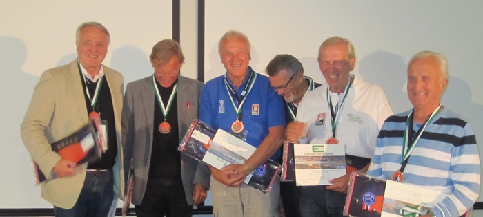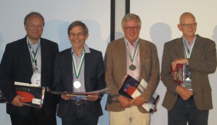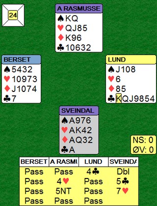 Det er fem spill igjen av semifinalen mellom SLUFSA og NORALIA, men kampen er avgjort. Trønderne leder med 57 IMP og det er ikke krutt nok igjen på de siste spillene til å ta inn så mye. I finalen blir det Norge mot Nederland og den starter kl. 10.00 i morgen. Da skal vi sitte pal og heie alt vi kan. Børre Lund - Ole Berset - Olav Arve Høyem og Aksel Hornslien NORALIA avsluttet med stil i det fjerde siste spillet. Først melder Jon og Arild en glimrende 7hj, men den spiller seg ikke selv. Arild vant med kløveresset og tok for bordets DKn i hjerter. Han oppdaget sitsen, men det gikk bra likevel Etter DKn i trumf tok han for KD i spar, tok ruter konge og spilte seg hjem i ruter. På sparesset falt tieren og da var det bare å stjele rutertassen i bordet. +1510. Kieron Dyke, Justin Howard, Arild Rasmussen og Jon Sveindal fikk bronse i EM!