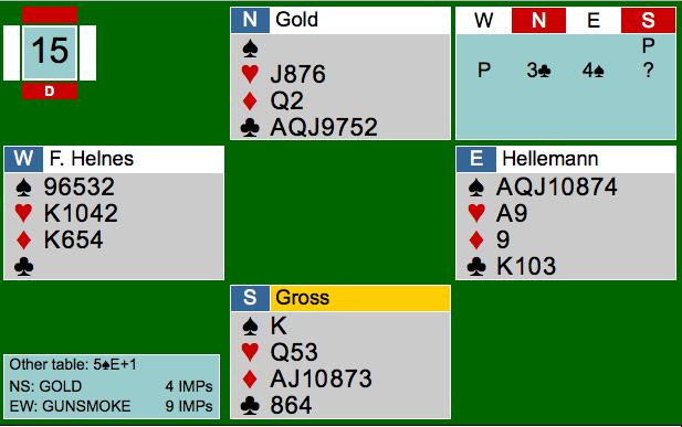 Det helnorske laget (jo, Tor Helness er norsk!) ligger fint an til å klare å bli blant de seksten lagene som går videre til sluttspillet. Her er to spill fra femterunde-kampen mot Gold fra England, og begge er med Anne-Lill Hellemann og Fredrik Helness. Paret har avtalene på plass mot sperremeldinger og den er slik: "Man sperrer ikke mot sperr". Det betyr at 4sp viser gode kort, omtrent ni stikk vil jeg anta. Etter pass fra syd i posisjonen under meldte Fredrik 5kl og viste fram renonsen sin. Det var mer enn nok for fru Hellemann som hoppet til 6sp. 11 IMP inn da engelskmennene stoppet i utgang på det andre bordet.