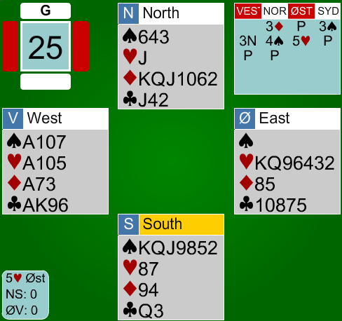 Dette er "moderne" bridge og det er effektivt. Thomas Charlsen i nord har en "opplagt" 3ru-åpning og syd fortsetter med 3sp som krav. Stakkar Gunn Helness i vest. I første omgang må hun nesten melde 3NT og jeg har også forståelse for passen på makkers 5hj. Det kunne fint vært en taper til i dette spillet, selv om denne gangen ble det brent slem. Likevel 9 IMP inn fordi vest på det andre bordet la seg i busken etter innledningen 2ru (svake to) - pass - 2sp (krav), og like etterpå måtte han ta stilling til 4sp. Vest doblet, men nå kunne nesten ikke øst ta ut i 5hj. +300 ble for spedt mot +680 på det andre bordet.