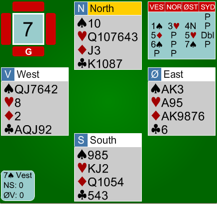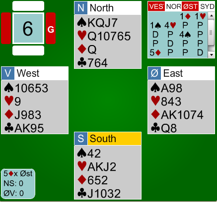 GRÅDIGHETEN FIKK SIN STRAFF? Det er mulig at dette er etterpåklokskap å kritisere nord for doblingen av 4sp, men Pernille Lindaas i vest gjorde en glimrende beslutning når hun tok ut 4spD i 5ru. Nord trodde julekvelden var kommet i 4sp. Det var den på en måte også, men når fruen fra Arendal tok ut i 5ru var kvelden over for NS. En litt forsiktig spilleføring og Jørn Arild fikk stjålet to hjertere i bordet og kastet en spar på EK i kløver. +750 og masse norske IMP!