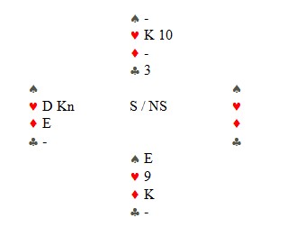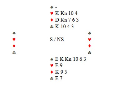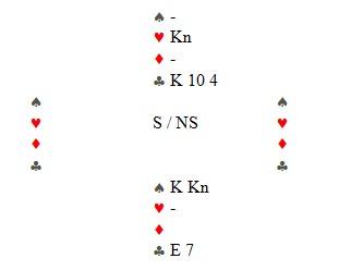 Dette er enkel logikk. Du vet at vest har igjen hjerterdamen og øst har igjen spardamen. Ergo kan ingen av dem ha igjen to kløver og bordets K10 vil 100% sikkert ta de to siste. Lett? ___________________________________________________________________________-
