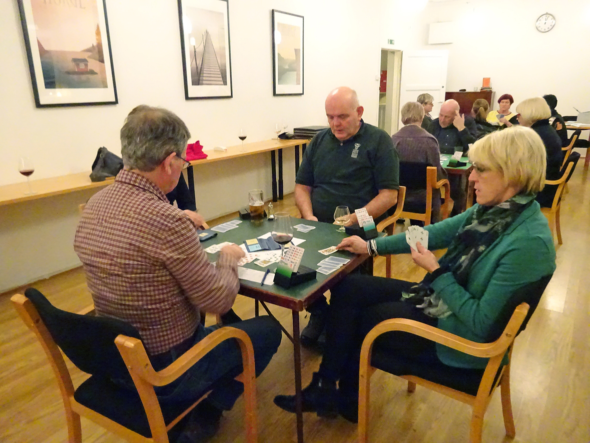 Tradisjonen tru arrangerte klubben tur til Herdla. I år gjekk turen helga 16. - 17. januar med heile 16 deltakarar. Ny rekord. Det blei ein strålande tur med god mat, god drikke, godt humør og god bridge. Her er eit bilete frå singleturneringa laurdag kveld. Tor Anders som speleførar, Gerd til høgre og Vilhelm som vann turneringa med ryggen til. Alle resultata frå Herdla under "les mer".