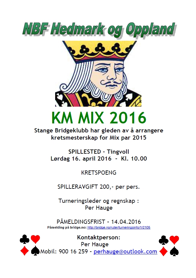 Sjekk forøvrig ut fanen "FemundBridge" på topplinja, her finner du informasjon om overnatting og adkomst, og et arkiv med resultater og artige spill fra de siste årene.