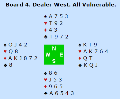 Ved det andre bordet kom topp-paret Gold-Bakhshi for høyt da de blåste ut i 6 grand. Syd spilte ut spar. Nå var det fryktelig enkelt for oss som så på, kløver tilbake og en bet. Så lett er det ikke ved bordet. Utspillet kunne sett fra nords synsvinkel ha vært unna spar konge, og i så fall har makkeren truffet blink! Det ble til at nord spilte spar tilbake, men da rasket Gold sammen tolv stikk på sekunder. Så til tross for at Norges Ø/V-par hadde gjort det riktige i meldingene tapte vi 13 IMP på spillet. Merk at spillefører hadde kun elleve stikk fra topp da han kom inn, men da hjerter satt 3-3 tok han resten (det var også en mulighet for hjerter-kløver skvis etter denne starten). Om 6 grand hadde blitt betet ville Norge vunnet 13 IMP i stedet, hele 26 IMP i sving i kampen Norge tapte med 21 IMP.