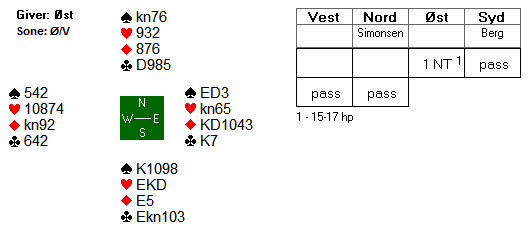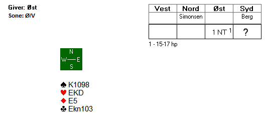 Før vi tar kvelden er det verdt å se på et spill fra dagens midtkamp. Du skal få samme meldeprøve som Erik Berg på det åpne laget fikk i kampen mot England. Hva melder du over 1 NT (15-17) med følgende kort?