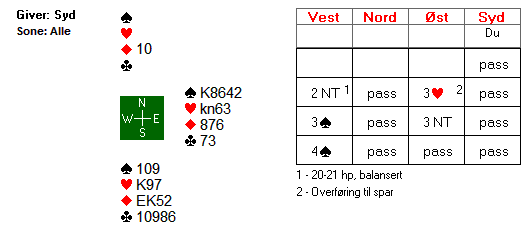 Makker spiller ut hjerter knekt mot 4 spar i nord etter at syd har vist en gående minorfarge. Du vinner første stikk med kongen i vest, mens spillefører følger med toeren. Hvordan planlegger du motspillet?