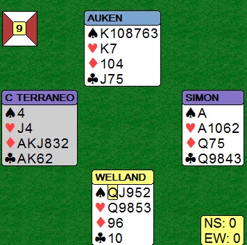 Tor Bakke: I det andre spillet fortsettes med ruter konge i stikk 2 som må vise også esset siden spillefører ikke stikker når Kn-10 er i bordet. Makker legger da styrke med damen eller dobbelton i ruter. Om ikke ruterfargen gir 3 stikk får vi håpe på et trumfstikk hos makker. (Makker bør også legge styrke i ruter hvis han har et sikkert sparstikk for å sikre seg at vi innkasserer beten ved å ta ruterstikkene. Ellers kan det være mulig å spille på renons i kløver hos spillefører og skifte til trumf.)