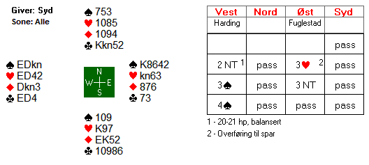 Det er et avtalespørsmål, og kanskje noe du selv kan sjekke om makkeren din har samme oppfatning som du har? Noen bruker det sikkert som såkalt cue-raise, dvs. sparstøtte og en god løft. Andre bruker 2 kløver til det formålet, og andre igjen både 2 kløver og 2 hjerter som støtte i spar med litt forskjellige håndtyper (for eksempel den ene viser trekorts-, den andre firekorts støtte). Selv liker jeg å bruke kun 2 kløver som cue-raise og 2 hjerter som naturlig, men det blir vel mest smak og behag. Øst mente han hadde avgitt et cue-raise, men det gjorde ikke makkeren og passet! Dermed var de i en tullekontrakt hvor de hadde ni spar til sammen. Omtrent to tredeler av Ø/V parene meldte utgang i spill 1 og gikk bet. Da Færøyenes øst gikk en bet i 2 hjerter delte han den scoren (-50) med en del par på butleren, men i kampen ble det 6 IMP ut.