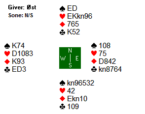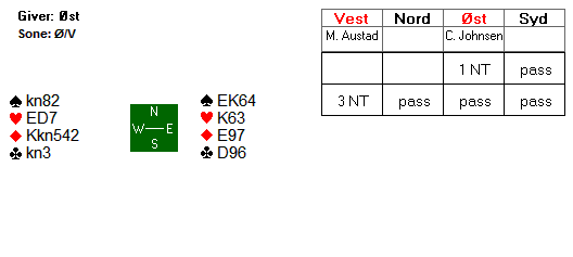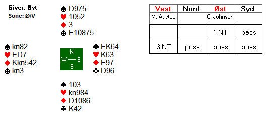 Med Nord som giver og Øst- Vest i faresonen meldte Svein og Knut 4 hjerter og Nord spilte ut ru 5 som løp til kongen fulgt av hj 7 til kongen og ny trumf til esset. Hell at trumffargen satt 2-2 imot. Nå kunne Svein ta for ru D og spille hj 4 til 5-eren i bordet. Han hadde nøye passet på ikke å bruke 4-eren i 1. runde trumf. På de tre stående ruterne i bordet kunne Åstrøm sake tapere, og kl K, D og sp 2 ble selvsagt valgt. Trumf hjem til hånden ga inntak og med spar opp mot bordet ble det taaper bare til esset som behagelig nok satt foran kongen. Bare Lars Helgesen maktet å kopiere 12 stikk, +680 og +10, der han og Tom Gjøs som de fleste andre spilte 4 hjerter. 3 bord fikk 11 stikk (+5), 3 bord fikk bare 10 stikk (-2) og for Nord – Syd fikk Jon Jahnsen til en fin stamp i 5 kløver som doblet bare var 3 bet, -500 men vant +7 på spillet.