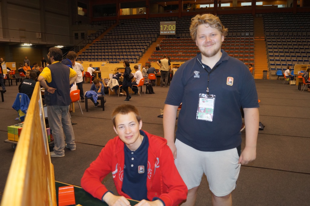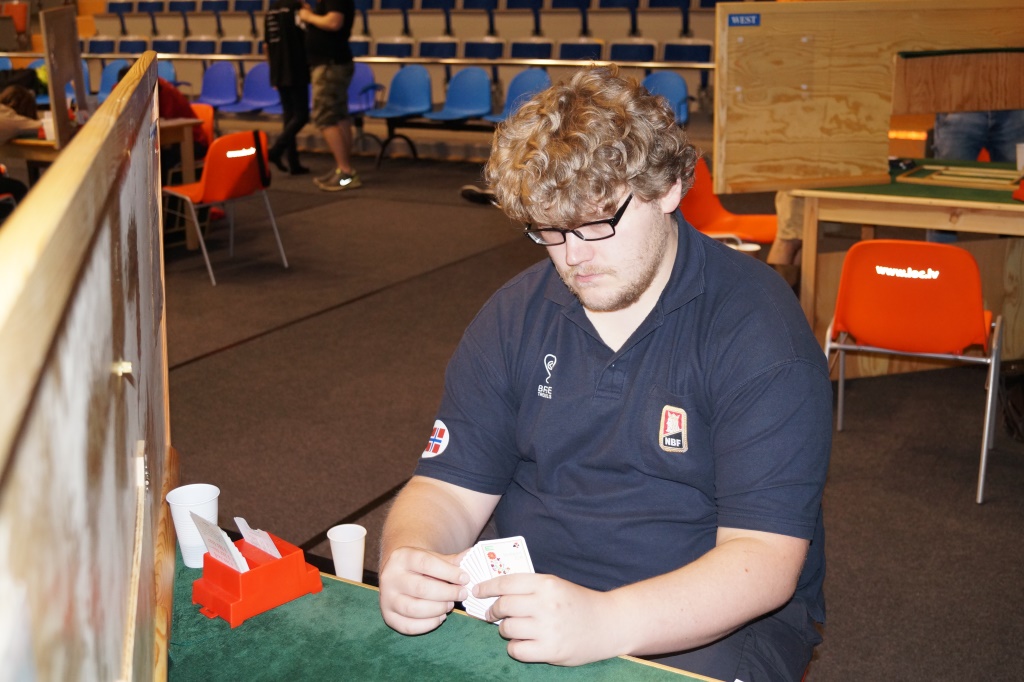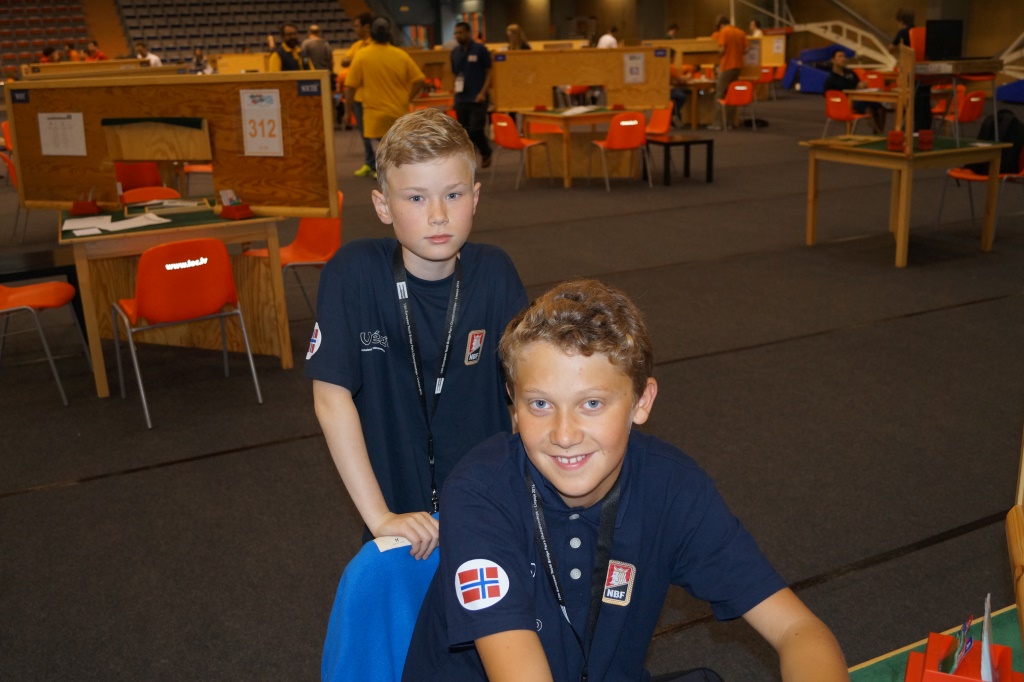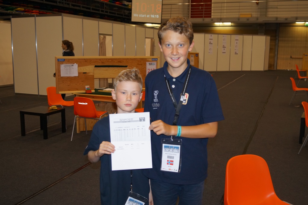 I U16-klassen deltar Kaja Brekke - Sanna Emilie Dybvik Dybdahl og Marius Dalemark Austad - Christian Fredrik Johnsen. Totalt 23 par deltar og det spilles dobbel serie med tre spill i runden uten noe finalespill. Gutta kom veldig godt i gang og ledet etter de første åtte spillene. Etter to sesjoner ligger de på en fin femteplass med scoren 59,37 %. Jentene har fire par bak seg. Resultater U16 Christian Fredrik Johnsen (bak) og Marius Dalemark Austad Kaja Brekke (bak) og Sanna Emilie Dybvik Dybdahl