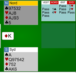 At der avsluttes bra gir løft også om man ellers ikke har hatt all verden av glid underveis. Johan Wedeen (S)- Magnus Larssen (N) fikk bra score ved bl.a. å overvinne skjev trumfsits. S giver og alle i faresonen.