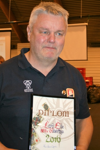 Min gamle juniormakker Lars Eide ble veldig fortjent tildelt NBFs hederstegn under bridgefestivalen i Fredrikstad. Den fikk han primært for sin mangeårige innsats for juniorbridge, men som Kari-Anne Opsal sa under utdelingen har han også vært fantastisk til å produsere (ikke helt alene, da, som Kari-Anne sa...) bridgespillende sønner! Laget i Wroclaw består av Lars som spillende kaptein, hans tre sønner Erik, Petter og Harald, og Bård Kåre Græsli og Kristian Ellingsen.