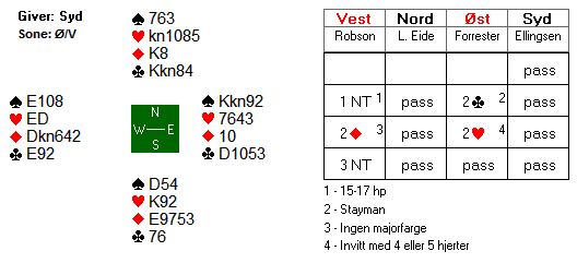 Jeg må si meg ganske uenig i Forresters meldevalg. Jeg regner med han håpet på å få et majorsvar fra makkeren som han kunne passe ned. Med det systemet de spiller finnes det visst ingen måte å stoppe i majorkontrakt på 4-3-tilpasning, i og med at 2 hjerter var invitt. Dermed fikk Forrester 3 grand fra makkeren. Hjerter ut er det klart beste for forsvaret, men i praksis var det ikke et alternativ slik meldingsforløpet hadde gått. Da Lars Eide valgte spar 7 (invittutspill) var den farga løst for spillefører. Kløveren sitter også fint for spillefører og hjerterkutten går. Da røyken hadde lagt seg ble det hele elleve stikk for spillefører etter at begge ruterhonnørene falt oppå hverandre i en desperat jakt på beit i kontrakten. Elleve nye IMP til England.