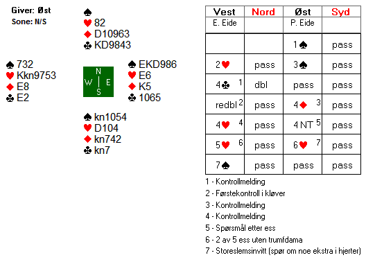 Allerede i kampens andre spill meldte brødrene Petter og Erik Eide seg helt opp i 7 spar. Spillet så slik ut: