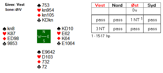 Nord vinner andre stikk med kløver knekt og fortsetter med en liten spar. Du får beholde stikket for spar konge fordi syd ønsker å holde forbindelsen åpen slik at nord har spar å spille når han eventuelt kommer inn.