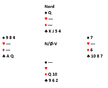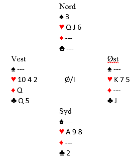 Med den veldig sterke hånden hos vest og brukbare verdier hos øst var det for mange vanskelig å stoppe under slem. Lilleslem i spar eller grand er egentlig samme spillet, normalt avhengig av 3-2 sits i spar og vellykket kløverfinesse. Som du ser går kløverfinessen galt, og ved nesten alle bordene der det ble meldt slem gikk spilleførerne bet. Men der syd forsøkte å være aggressiv i tredje hånd utenfor sonen og åpnet med 3 ruter fikk vest den hjelpen han trengte. Ruter knekt kommer ut mot 6 spar (eller grand). Vest vinner og tar for E-K i spar. Om han nå spiller nok en spar er kløverfinessen eneste mulighet, og det blir bet. Men etter syds 3 ruteråpning bør det vel ikke være alt for vanskelig å se at nord kan strippes for frikort før han spilles inn i spar? Etter to store spar spilles fire runder hjerter. Siden nord viser seg å ha fire hjerter er sluttspillet nokså tegnet. Vest tar for den andre ruterhonnøren og stripper dermed nord helt for røde kort. Dette blir igjen: