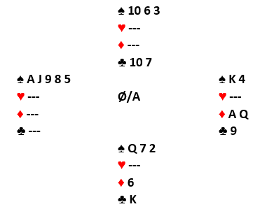 Muller vant med kløver ess andre gang og tok ruterstikkene. På den første fulgte jeg, og på den tredje ruteren la jeg kløver 10 fra 10-6 for å late som om jeg hadde igjen K-10. Så kom den siste ruteren, og nå måtte jo jeg (hvis det var slik at jeg hadde kløver konge) kaste en spar, kanskje fra damen tredje opprinnelig? De to sitsene Muller måtte velge mellom var med fem kort igjen: