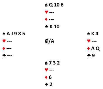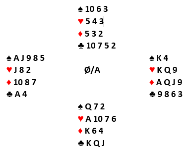 Da jeg på de to ruterstikkene kastet kløver 10 og en liten spar spilte Bauke spar konge, og jeg fulgte med tieren fra 10-6. Jeg satt igjen med spar 6 og kløver 7, men det kunne jo godt være jeg satt igjen med spar dame og kløver konge? Han visste jeg hadde en spar og en kløver igjen i trekortsposisjonen. Nå spilte han spar mot bordet og måtte velge: ta sparfinessen og se at det ble to bet hvis alternativ 2, vårt falske bilde på sitsen var den riktige. I så fall får jeg resten, for singel spar dame og kløver konge), eller satse på at jeg var skviset og toppe ut spar dame.