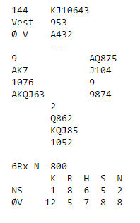 Jon (vest) åpnet med 1 kløver og det kom 1 spar innpå fra nord. Øyvind passet, 2 ruter fra syd, og 3 kløver fra vest. Nord meldte 3 ruter, og Øyvind hadde nesten til 4 ruter, men nøyde seg med 5 kløver. Hvis det hadde gått pass rundt der ville det blitt omtrent middelspill. Men nord meldte ikke unaturlig 5 ruter i de gunstige soneforholdene. Da passet øst, kravpass, han forteller med det at at han ikke tror nok en melding fra makker behøver å være så galt. Hvis øst hadde strukket seg til 5 kløver i forrige runde ville han doblet nå. Aabye var med på notene og meldte 6 kløver! Det kom spar ut og finessen med damen ble tatt med det samme. Siden kløverfargen satt 3-0 ble spillefører avhengig av hjerterfinessen, og som Saur sa til meg: "og selvsagt gikk den, sånn var det denne helgen".