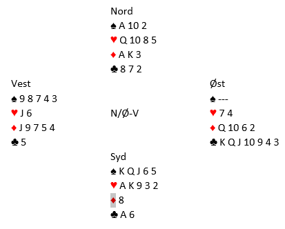 Det var en reell «blemme» av Syd. Har makker lovt minst 5-5 i minor har Øst max singel ruter, og med 5+ hjerteråpning kan ikke Øst ha mer enn dobbelton der heller. Dessuten- hva betyr kl D fra Nord i 1. stikk? Viser det mer enn bare tett kløverbeholdning uten kongen?