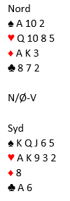 De møtte Paul Thomassen (N)- Svein Andersen (S) fra Vest- Finnmark som fikk flott 5. plass. Jon (V) åpnet med 1 kløver, N gikk innpå med 1 spar og Øyvind passet. Svein meldte 2 ruter, Jon 3 kløver og Paul 3 ruter. Saur hoppet så til 5 kløver men da Nord etter to ganger pass meldte 5 ruter var ikke Jon utmeldt. 6 kløver fikk tilslaget- udoblet. Sp J ut satte max press på Aabye, men han kom i mål slik:
