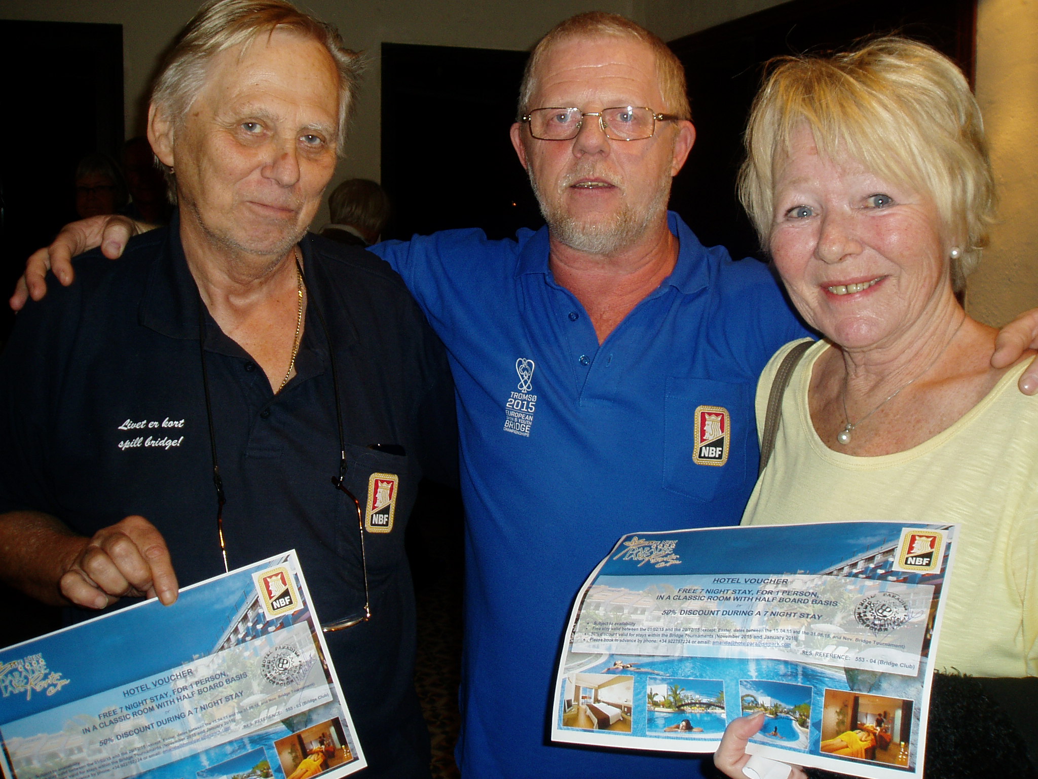 På Paradise Park, Los Cristianos, Tenerife er den første av 3 uker i VI NBF and Paradise Park Bridge Festival avviklet med 10-13 bord i både A og B-puljen i trivelige omgivelser og hyggelige bridgespillere. Vi har dessuten spilt facitbridge hver kveld på hotelltaket og vi har hatt quiz-kvelder. I hovedturneringene fredag/lørdag stiller Hotel Paradise Park med førstepremier i begge puljer, som er 1 ukes opphold, eller 50% reduksjon på hotelloppholdet ved deltakelse på bridgefestivalene i november 2015 eller januar 2016. Dessuten har Eiendomsselskapet Solmar Vest ved sin norsk eier Ivar Olsøn-Lunde stilt opp med pengepremier til 2.plassene i A og B, samt tennisskjorter.