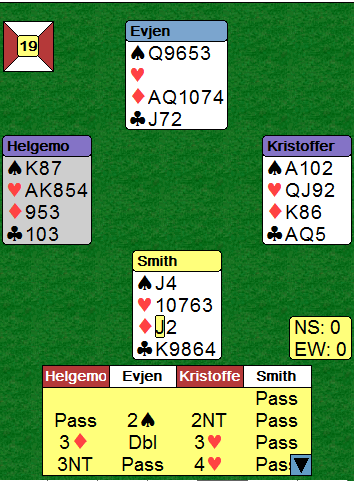 Ved begge bord ble øst spillefører i 4 hjerter etter at nord hadde meldt spar, og ved begge unngikk syd å spille ut spar knekt som ville gitt spillefører kontrakten på et sølvfat (løser sparfargen uten taper for spillefører). I stedet valgte begge sydspillerne ruter knekt i utspill. Den gikk til esset fulgt av ruter dame til kongen i andre stikk. Trumfen 4-0 skapte problemer. Hvis den hadde vært jevnere fordelt kunne spillefører ha tatt ut to eller tre runder trumf og fridd seg med ruter. Da ville nord vært nødt til å spille spar eller kløver, og begge deler gir spillefører sjansen. Kløver fra nord er unna knekten,og hvis øst legger liten blir det to kløverstikk for E-D og en spar kan kastes hos vest på tredje kløver. Hvis nord spiller spar kan øst legge liten (må riktignok gjette, for nord kunne godt ha hatt D-kn i spar), og syd må på med knekten som stikkes med kongen. Senere lykkes en sparfinesse med tieren og det blir ti stikk. Men med trumfen 4-0 var det verre. Spillefører kunne etter etter tre runder trumf latt syd få beholde en trumf og spilt ruter Hvis nord får vinne det stikket er han innspilt og må gi kløver eller sparfavør, og om syd trumfer makkerens ruterstikk er syd innspilt og må gi favør. Ved begge bord ble etter et par trumfrunder kløverfinessen tatt i stedet for det mulige innspillet i ruter. Syd vant, og Buskeruds syd skiftet nå til spar knekt. Dermed vant Kristoffersen ti stikk da han unngikk spartaper. I samme situasjon (inne på kløver konge over østs dame) fortsatte Brogeland med kløver til tier, knekt og ess. Spillefører (Saur) tok ut syds to siste trumf før han trumfet sin siste kløver. Dette var igjen: