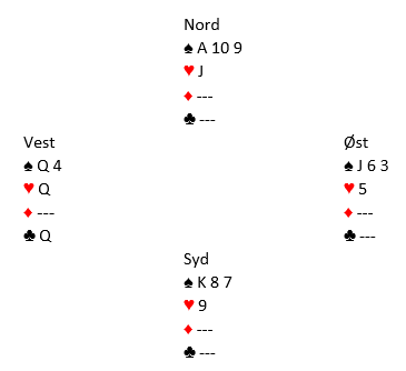 En liten kløver kom ut til syd. Ruter til kongen vant neste stikk, og da fulgte liten ruter fra nord. Nå la øst liten, og da krevde åtteren vests ess. Det ville vært bedre motspill av øst å legge i en stor ruter. Da vil fortsatt en meget interressant utvikling skje, men de variantene kan du få pusle litt med selv. Den enkleste måten å bete 4 spar på er å spille ut hjerter til esset og mer hjerter. Da får forsvaret tak i to stikk i den fargen samt ruter ess, og spillefører har ingen mulighet til å få til noe lignende som du her skal få se skjedde. Etter ruter til kongen gikk det altså ruter til åtteren og esset. Vest skiftet til hjerter til østs ess. Derfra kom kløver til syds andre honnør. Saur tok for ruter dame og kastet en hjerter fra nord. Så den fjerde ruteren. Vest kastet en kløver og nord kunnes trumfe. Så ble nords tredje kløver trumfet hos syd, og dette var igjen: