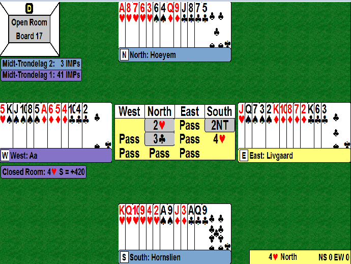 Det var vanlig med sluttkontrakt 4 hjerter, men Ø/V har en billig stamp i 4 spar. Høyems 2 hjerteråpning med disse kortene ser ufyselig ut i mine øyne, men det er helt klart at denne gangen var konvensjonen (hjerter og en minor) perfekt, for det gjorde at Ø/V ikke kom med i meldingene. Kanskje burde syd sagt 4 hjerter direkte, for med ellevekorts hjertertilpasning er det siste du vil at motparten kommer med og finner en stamp. Å si 2NT (spørsmål) må vel være for å finne ut om slem kan stå? Kan egentlig slem være mulig sett fra syds synsvinkel? Kanskje, men det er lite sannsynlig, så å hoppe ut i 4 hjerter med det samme har mye for seg. Det gikk bra via 2NT - krav - også, vest hadde ikke riktig til å melde.
